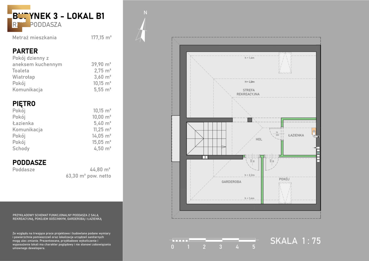 Powierzchnia 44,80 m² (63,30 m² po podłodze) z przygotowaną instalacją na dodatkową łazienkę.