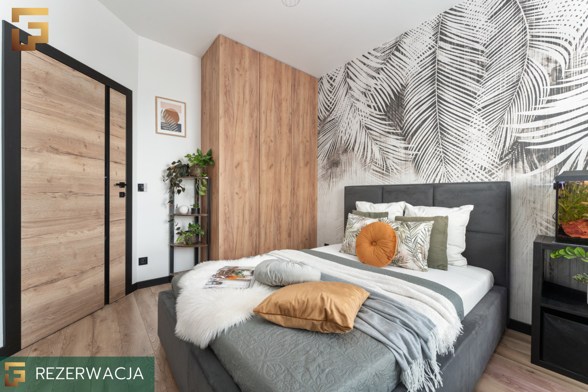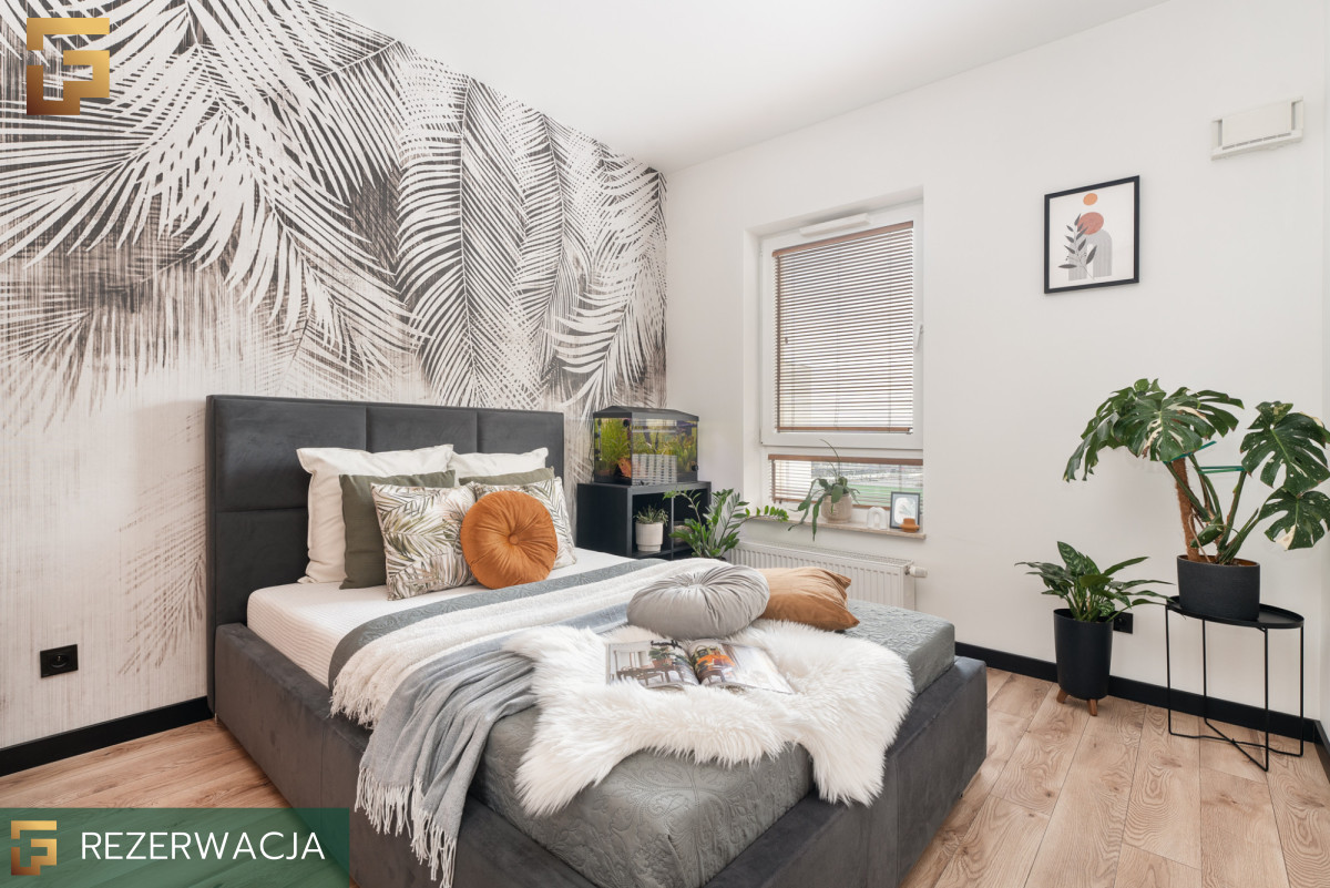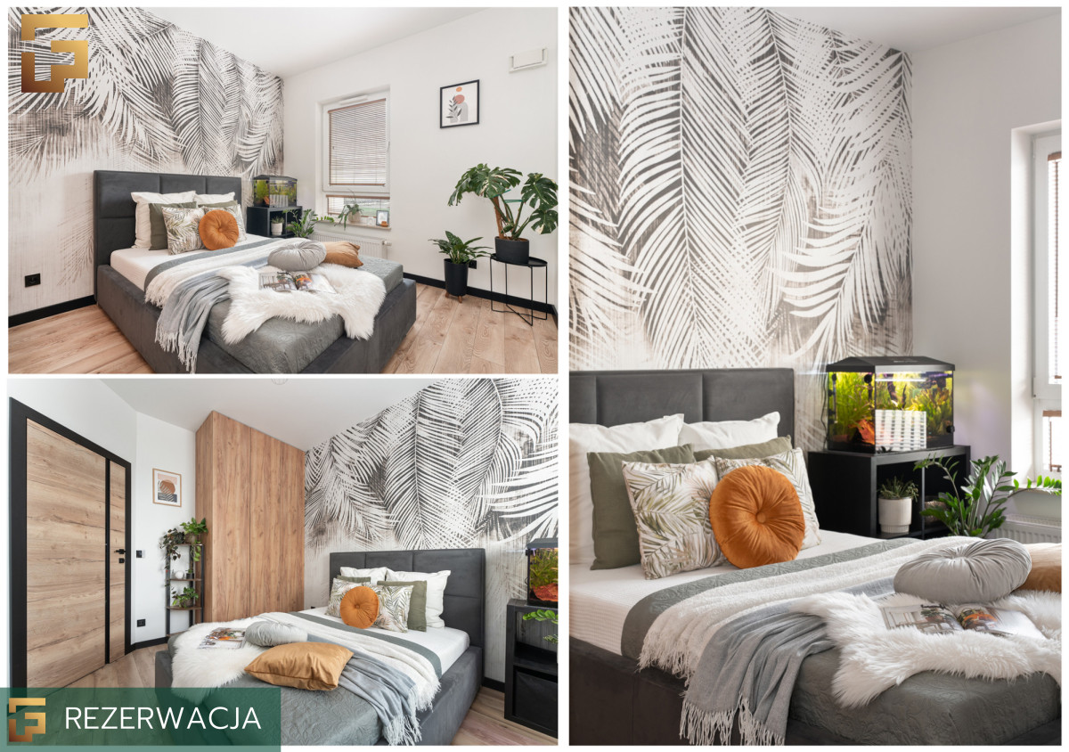 Sypialnia o powierzchni ok 9 m² została zaaranżowana w sposób maksymalnie funkcjonalny, a jednocześnie przytulny. W małej przestrzeni udało się zmieścić pojemną szafę w zabudowie, wygodne łóżko o wymiarach 140 × 200 cm oraz praktyczną szafkę nocną. Jasne ściany w połączeniu z efektowną tapetą z motywem liści optycznie powiększają wnętrze i nadają mu charakteru. Całość uzupełniają rośliny doniczkowe oraz drobne dodatki, które tworzą spokojną atmosferę do wypoczynku.