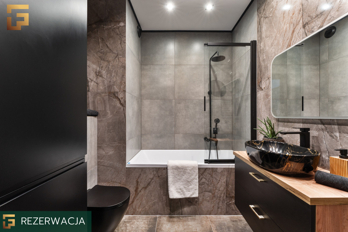 Mieszkanie urządzone z sercem i dbałością o detale, wyposażone w meble na wymiar robione przez stolarza. Na lewo od wejścia znajduje się funkcjonalna łazienka - 4,5m², z wanną i WC, szafki na chemię i kosmetyki, oraz pralka w zabudowie.