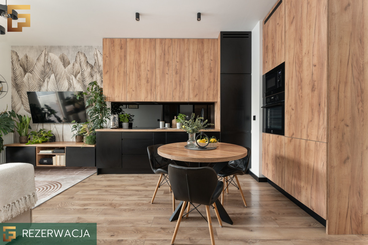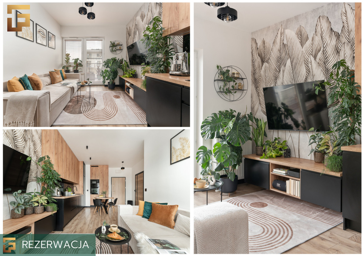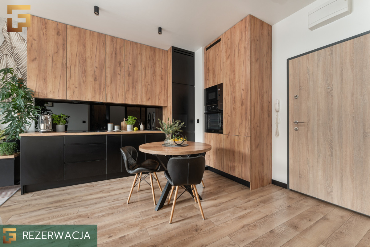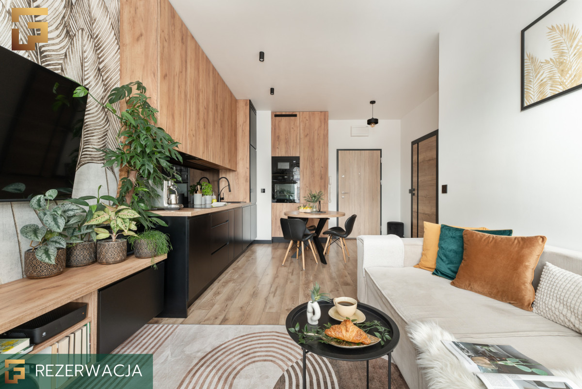Część dzienna to otwarta przestrzeń z wyjściem na balkon, dzięki usytuowaniu od wschodniej strony, mieszkanie nie nagrzewa się w gorące dni, a mimo wysokiego piętra przez cały dzień jest wystarczająco dużo światła. W pełni wyposażony aneks kuchenny z zabudowaną lodówką, zmywarką, płytą indukcyjną, oraz piekarnikiem i mikrofalówką Electrolux pozwala na swobodne gotowanie. W salonie mamy wygodną kanapę z funkcją spania, szafkę na wymiar wykonaną pod kolorystykę w aneksie oraz TV na ścianie. Mimo niewielkiego metrażu ok. 21m² znalazło się też miejsce na okrągły stół z 3 krzesłami.