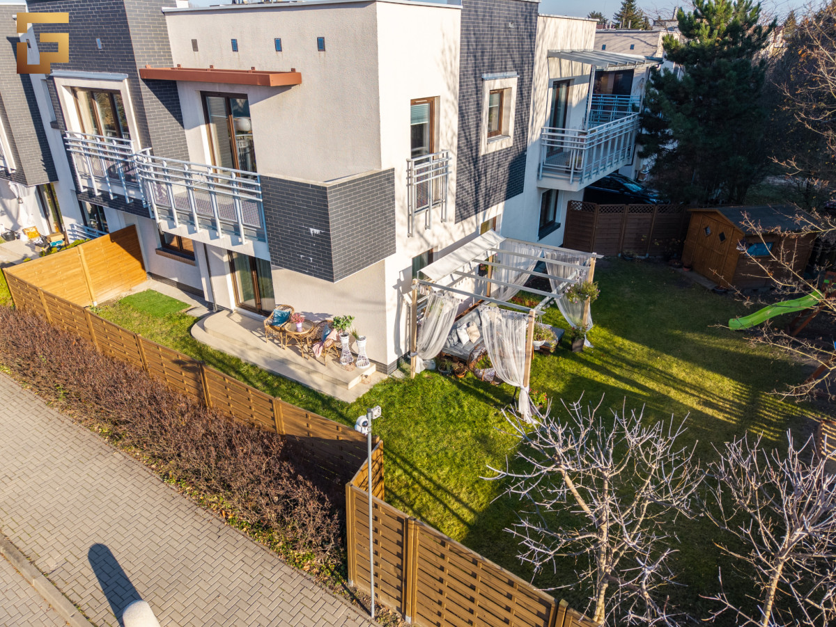 Dodatkowym atutem tej nieruchomości jest ponad 200m2 ogród, w którym znajduje się mała piaskownica, huśtawki, domek narzędziowy oraz meble ogrodowe. Orientacja południowo zachodnia pozwala na całoroczne korzystanie z prywatnej strefy wypoczynku.