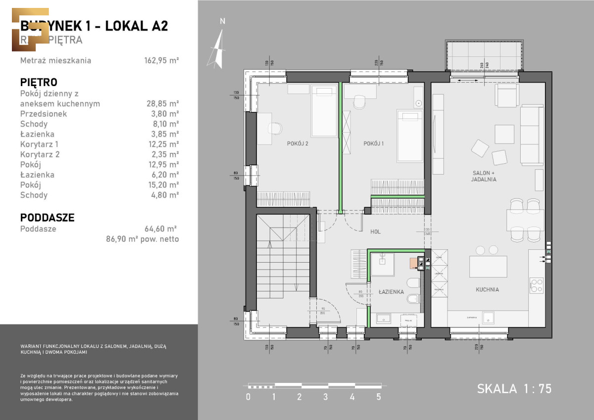 Obecnie w ofercie dostępne są dwa lokale mieszkalne w zabudowie bliźniaczej, każdy o powierzchni 162,95 m², rozłożonej na piętro oraz poddasze użytkowe. Domy zostały zaprojektowane z myślą o komforcie i nowoczesnych rozwiązaniach technologicznych - zostaną wyposażone w pompy ciepła, systemy ogrzewania podłogowego oraz klimatyzację.