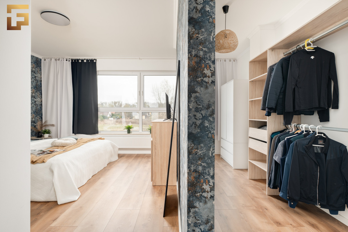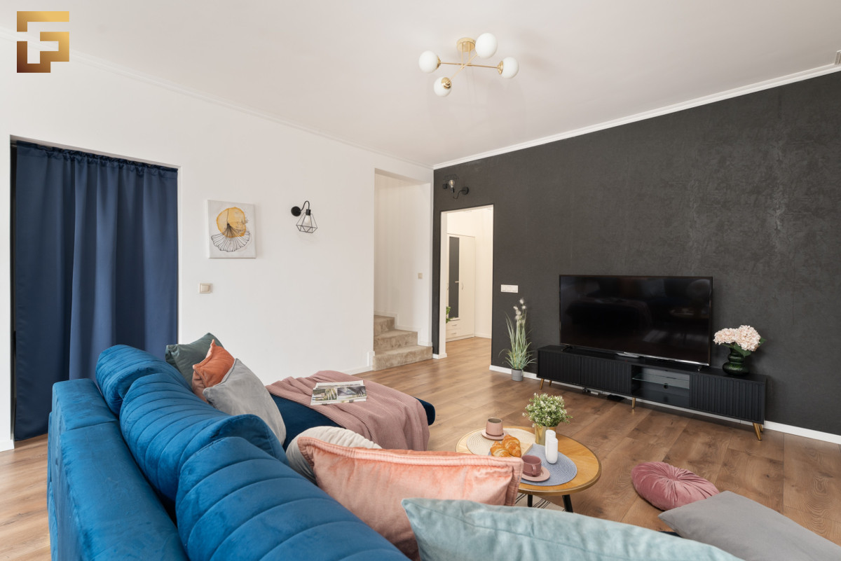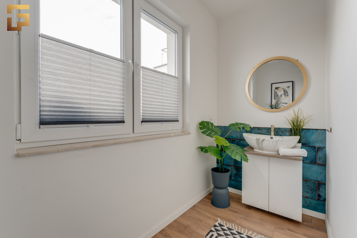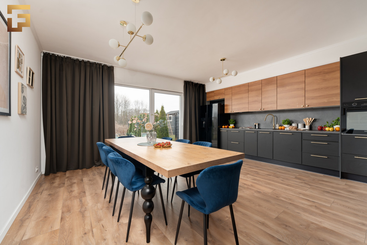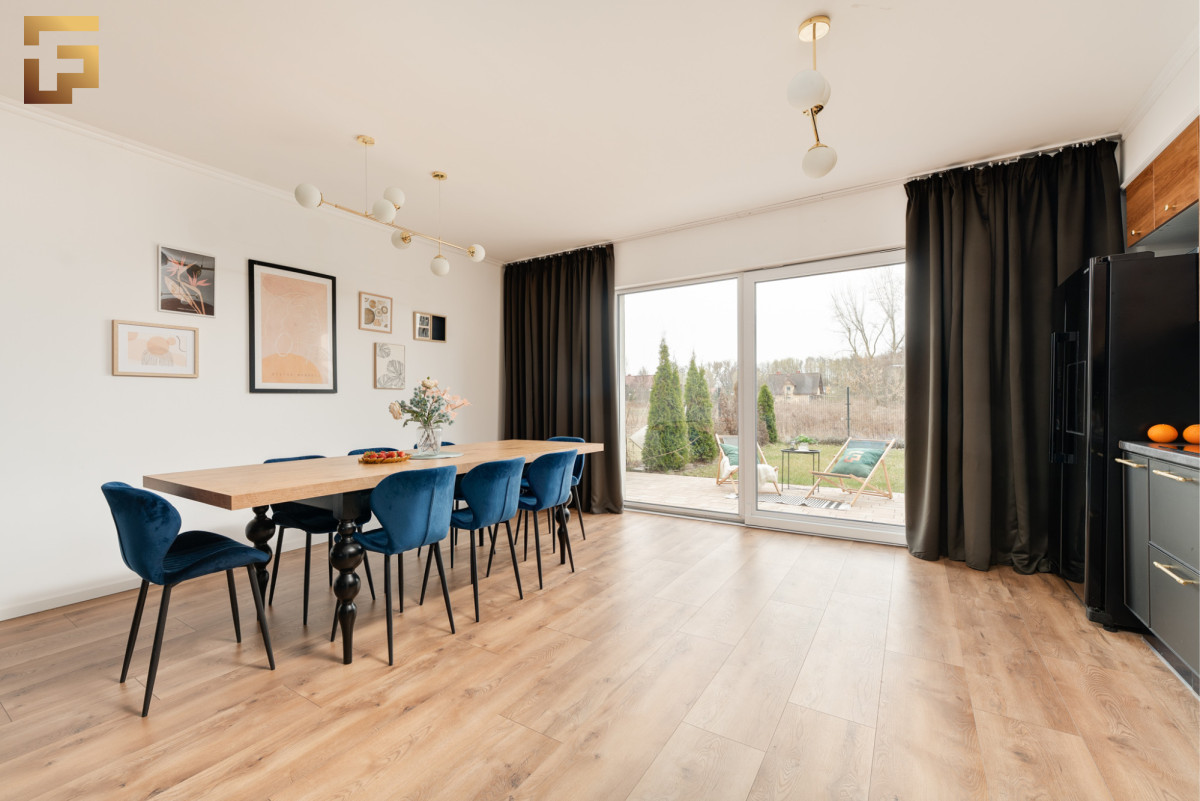 Nieruchomość została wykończona w 2023 roku, a jej układ dostosowano do indywidualnych potrzeb właściciela. Największą zmianą było powiększenie strefy dziennej - dzięki temu uzyskano ponad 40 m² otwartej przestrzeni, łączącej salon z jadalnią i kuchnią. To funkcjonalne i wygodne rozwiązanie do codziennego życia.