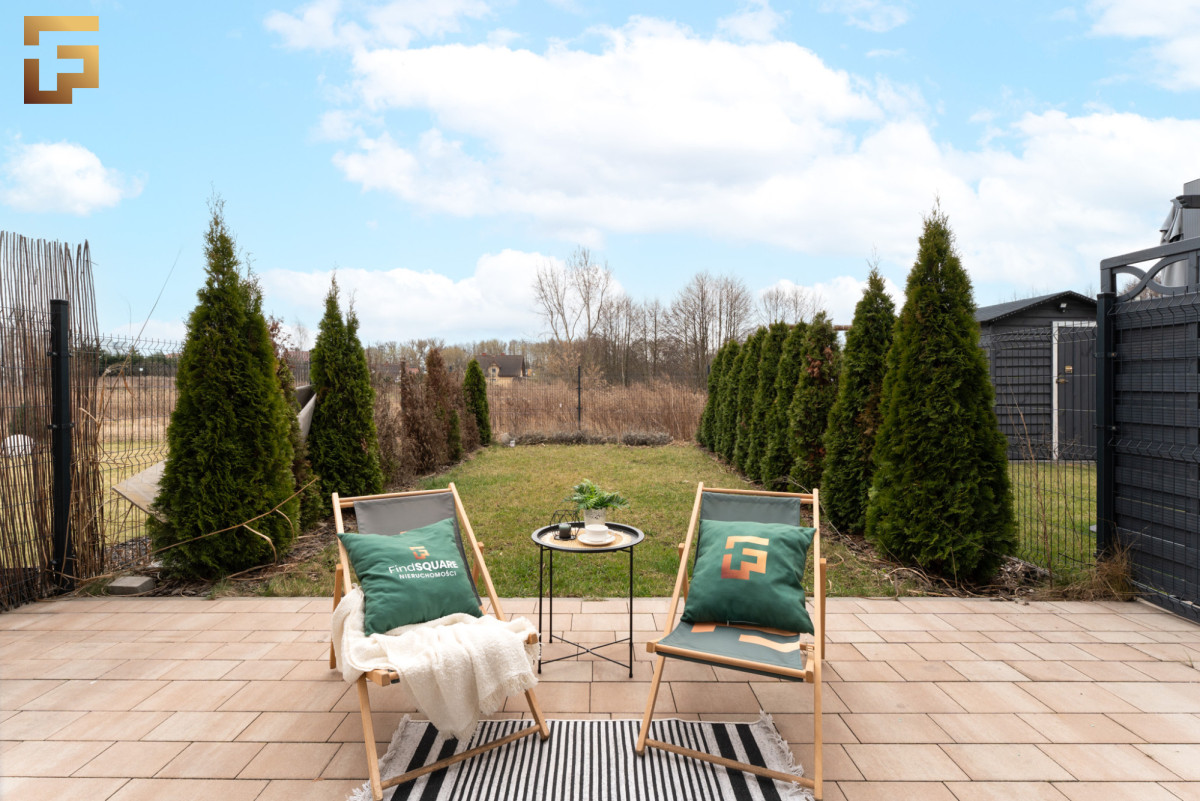 Z salonu prowadzi wyjście na ogród przez duże przeszklenia typu HS, które zapewniają dobre doświetlenie wnętrza. Ogródek o powierzchni około 60 m² wychodzi na otwartą przestrzeń zieloną - brak zabudowy po tej stronie gwarantuje prywatność i widok na naturę, gdzie często można spotkać dziką zwierzynę. To miejsce szczególnie docenią osoby posiadające zwierzęta lub szukające spokojnego otoczenia.