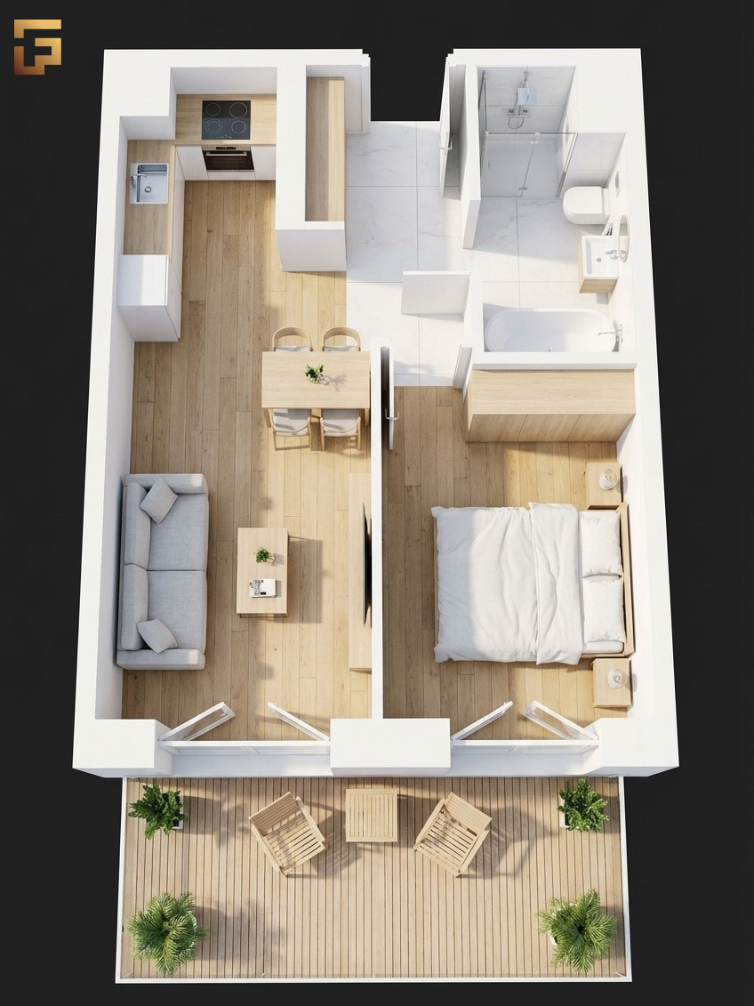 Układ mieszkania jest bardzo funkcjonalny jak na ten metraż. Część dzienna została zaplanowana jako salon z aneksem kuchennym, który dzięki odpowiedniemu projektowi może stać się wygodną i ergonomiczną przestrzenią do codziennego życia. Oddzielna sypialnia daje komfort prywatności, a ustawny przedpokój pozwala na zaplanowanie praktycznej zabudowy.