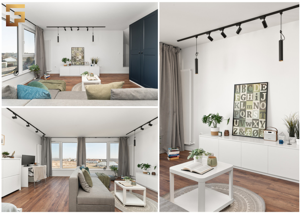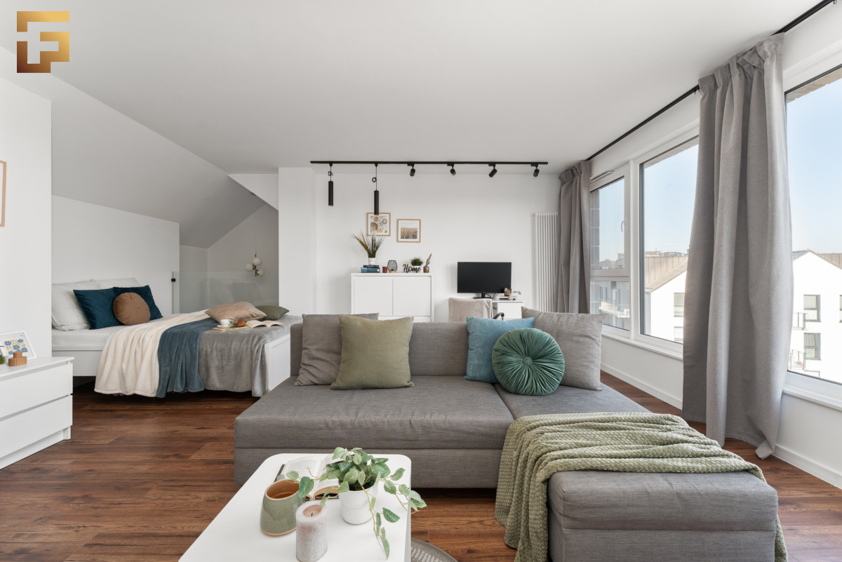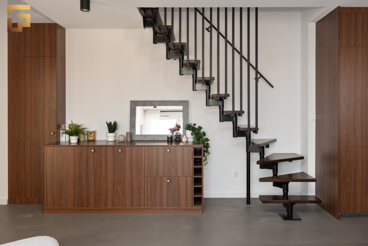 Przedstawiamy Państwu wyjątkowe dwupoziomowe mieszkanie. Staranne wykonanie jak i zaplanowana aranżacja prezentuje się elegancko i świeżo. Na podłodze mamy mikrocement dekoracyjny w kolorze light-grey, na antresoli zostały położone panele podłogowe w kolorze ciemnego brązu. Zabudowa salonowa oraz kuchenna została wykonana na zamówienie w kolorze orzechowym firmy Kronospan.